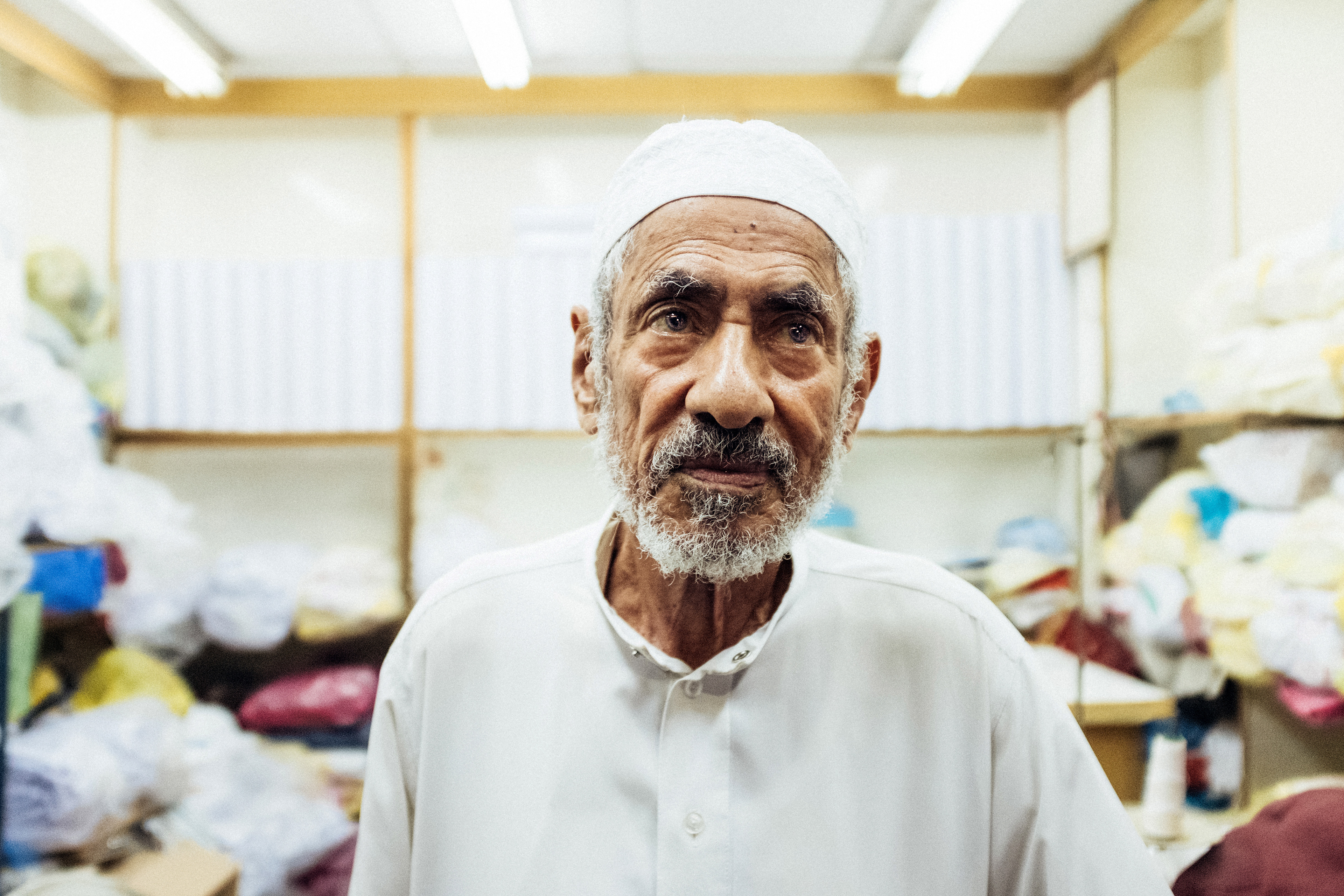 العم أبو محفوظ يبلغ من العمر ٦٢ عاماً امضى ٤٠ سنة منها في المملكة العربية السعودية كخياط للثياب والوزر اليمانية مع عمه المرحوم بالبطحاء، ثم انتقل بعد ذلك إلى سوق الثميري حتى هذه اللحظة. توقف العم عن الخياطة منذ ٤ سنوات على إثر عملية خاضاها في عيني واكتفى بالبيع