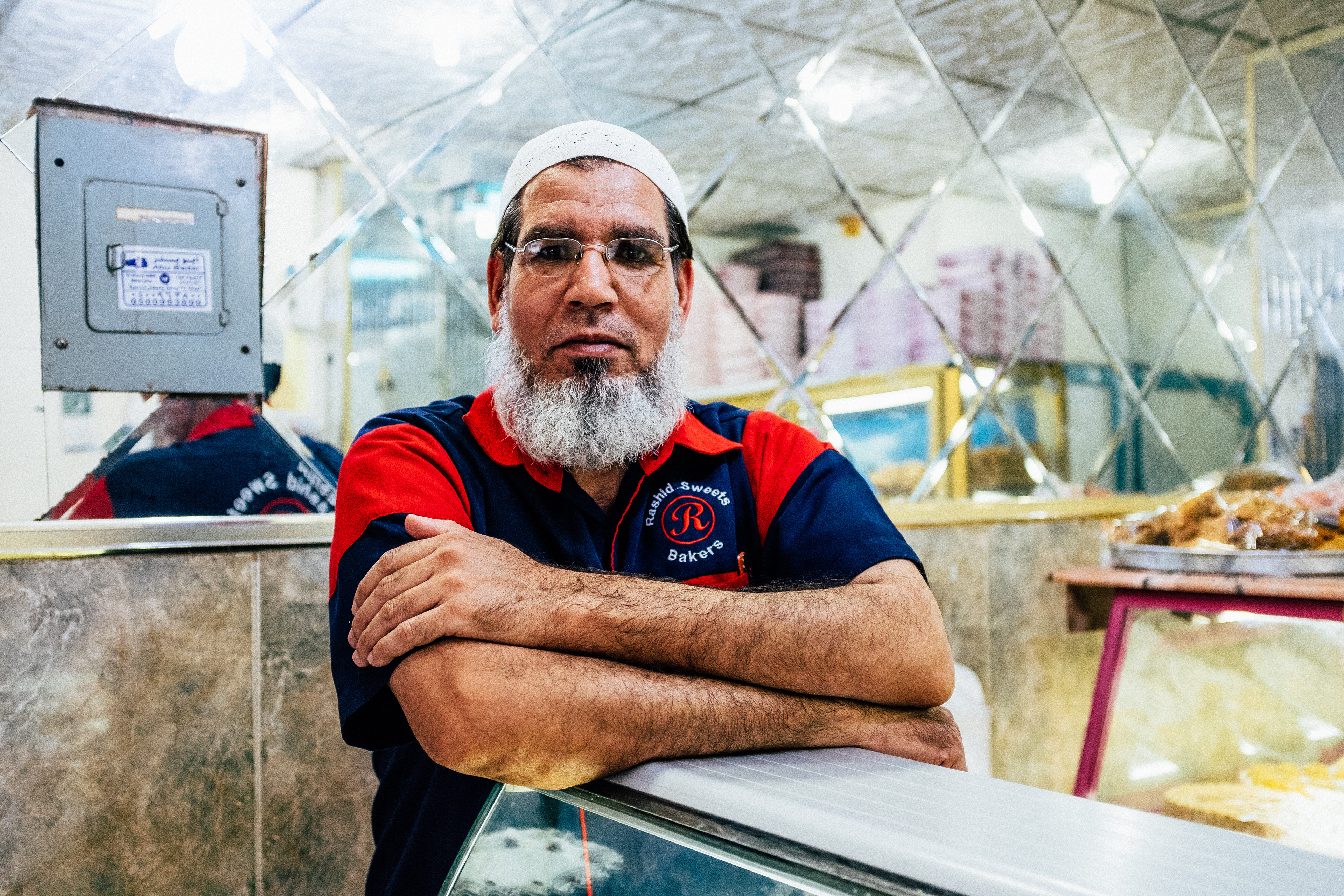 محمد رياض باكستاني الجنسية صانع للحلويات والمخبوزات بنفس المعمل منذ ٢٥ سنة